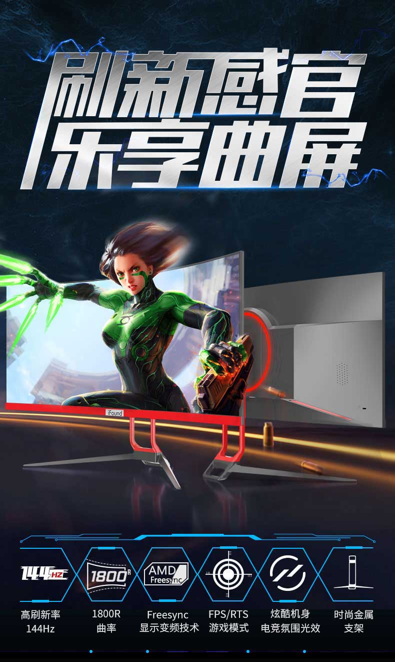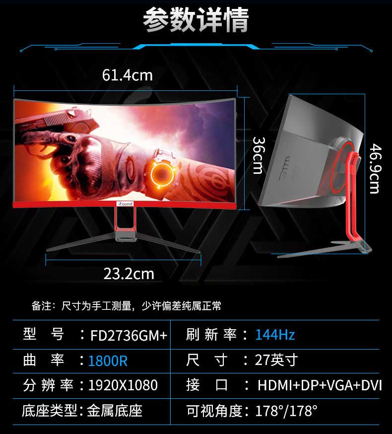 商品名称:方正iFound FD2736GM+ 27英寸144Hz 电竞曲面微边框游戏滤蓝光不闪屏电脑显示器 FD2736GM+/144Hz/1080P/多接口 一件